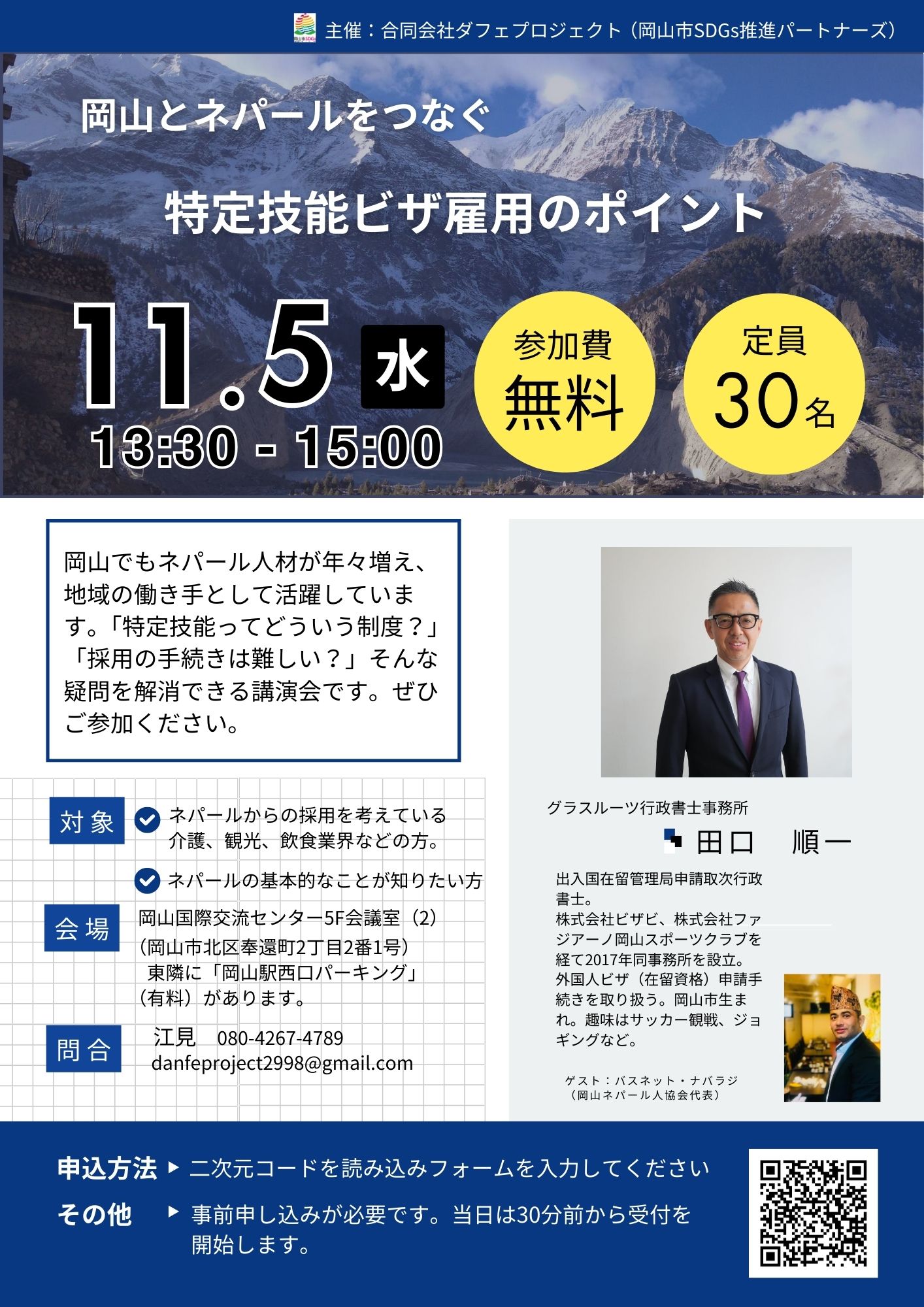 11月5日に講演会「岡山とネパールをつなぐ 特定技能ビザ雇用のポイント」をおこないます。